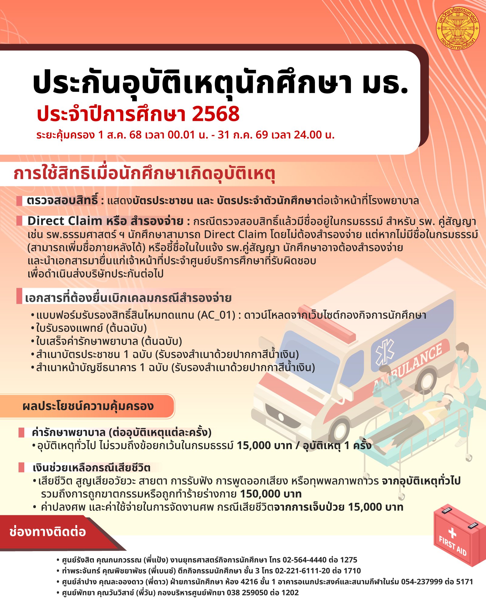 1. ตารางผลประโยชน์ความคุ้มครอง ปีการศึกษา 25682. โปสเตอร์ประชาสัมพันธ์ประกันนักศึกษา ปีการศึกษา 25683. แบบฟอร์มเรียกร้องค่าสินไหมทดแทน AC_01 กรณีสำรองจ่าย
